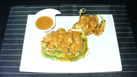 - Die Erdnussbutter wird mit den Zutaten in einen Topf gegeben und leicht erwärmt. Nach und nach wird das Wasser zugefügt, bis die Soße die richtige Konsistenz aufweist.