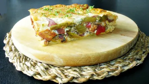 - Gehackte Zwiebeln, Salamiwürfel, Paprikastreifen, sowie gewürfelte Tomaten und Oliven werden in etwas Öl angeschwitzt, mit Salz, Pfeffer und Kräutern der Provence abgeschmeckt und in die Form auf den Teig gegeben.