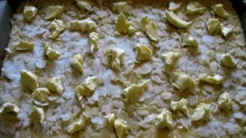 - Den Zucker und die Mandeln für den Belag vermischen und darüber streuen, dann die Butter in kleinen Flöckchen darauf geben und ab damit in die vorgeheizte Backröhre.